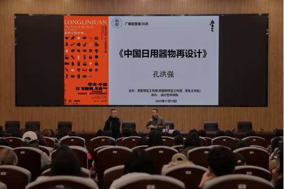11月19日下午,深圳市学古实业有限公司董事长孔洪强应邀做客我校广雅鳣堂,在我校研究生艺术实验大楼报告厅作了题为《中国日用器物再设计》的讲座。设计艺术学院副院长张三聪主持讲座,师生代表共计270余人现场聆听。