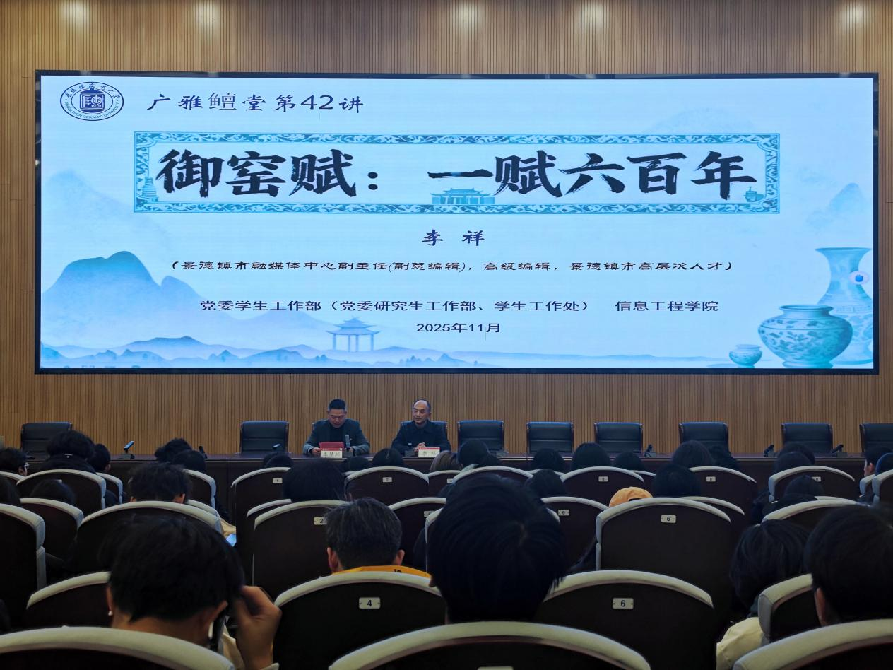 11月28日下午,1989级校友、景德镇市融媒体中心副主任李祥应邀做客我校广雅鳣堂,在湘湖校区研究生艺术实验大楼报告厅作题为《御窑赋:一赋六百年》的专题讲座,师生代表共200余人到场聆听。本次讲座由信息工程学院党委书记李慧颖主持。