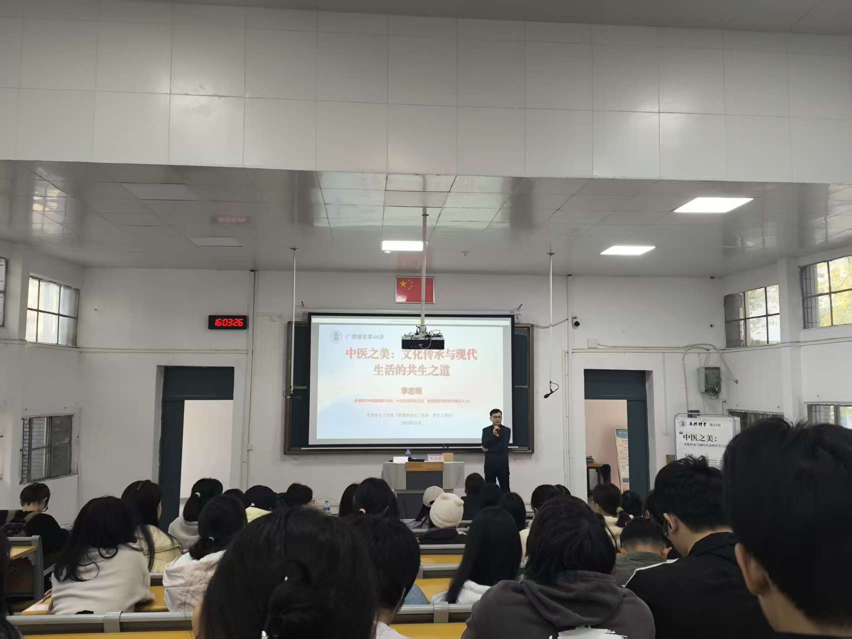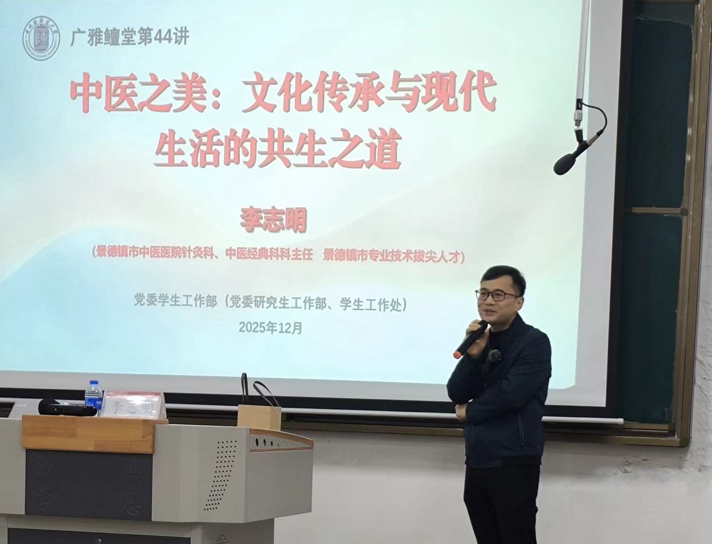 2025年12月11日下午,景德镇市中医医院针灸科、中医经典科主任李志明应邀做客我校“广雅鳣堂”第44讲,在新厂校区东阶教室作题为《中医之美:文化传承与现代生活的共生之道》的专题讲座。
