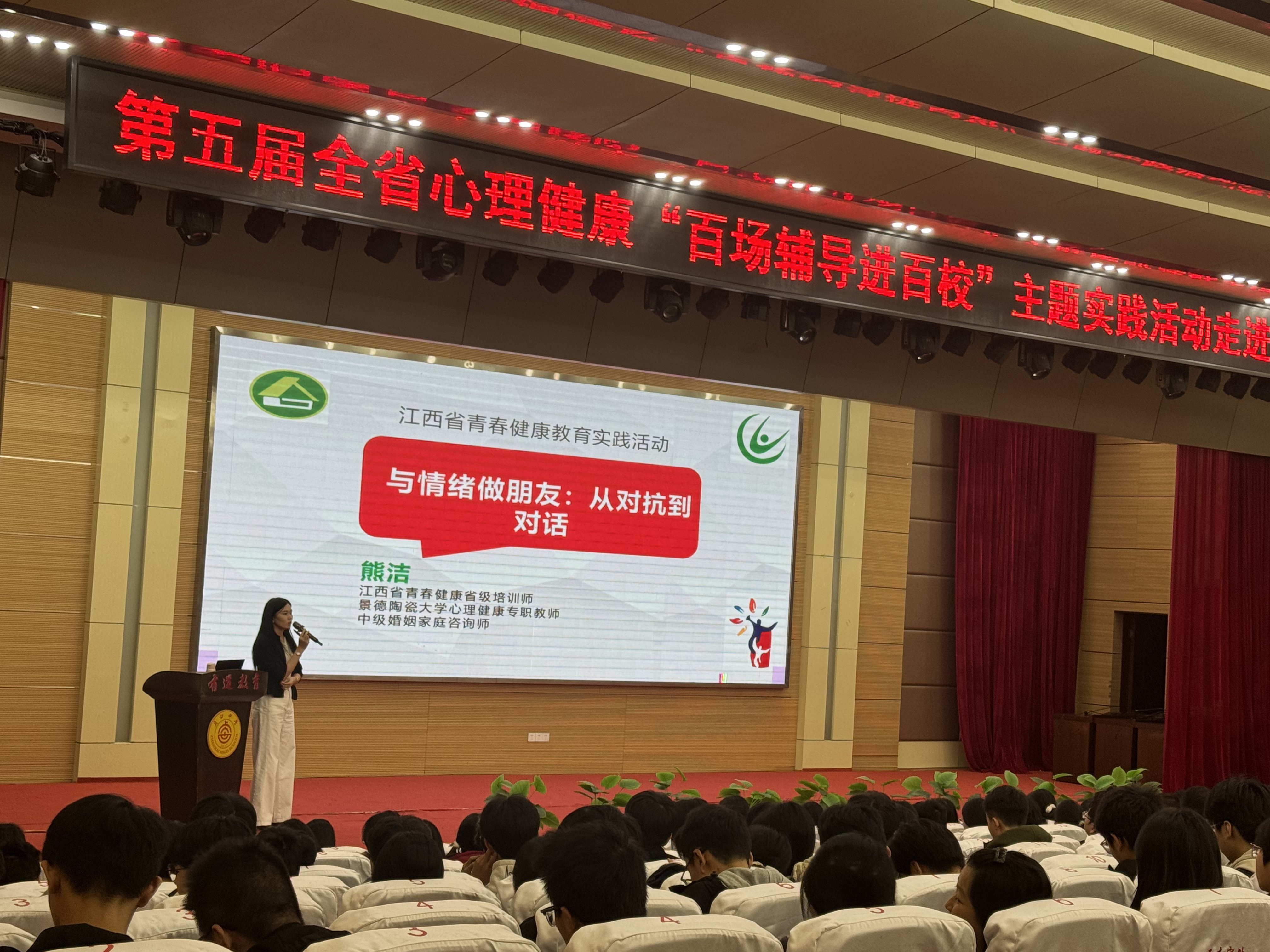 2025年10月23日,景德镇陶瓷大学青春健康俱乐部“青少年青春健康教育实践活动”走进广丰贞白中学。江西省计生协青春健康省级师资、景德镇陶瓷大学心理健康专职教师熊洁,为广丰贞白中学高二年级600余名同学带来了一场内容详实、形式活泼的“与情绪做朋友:从对抗到对话”青春健康专题讲座。