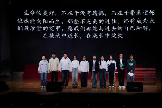 这场表演以一系列小故事串联起不同人的内心独白,呈现出每个人视角下的自我叙述与情感波澜。正是由于视角的差异,同学们之间产生了误解与自我怀疑。最终,在一位同学的帮助下,大家理清了事实的原委,让生活重回正轨。经历这番波折后,每个人都得以走出内心的挣扎,勇敢说出真相,也重新找回了那份真挚与热忱。