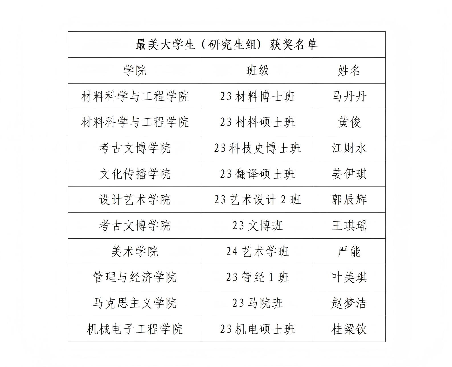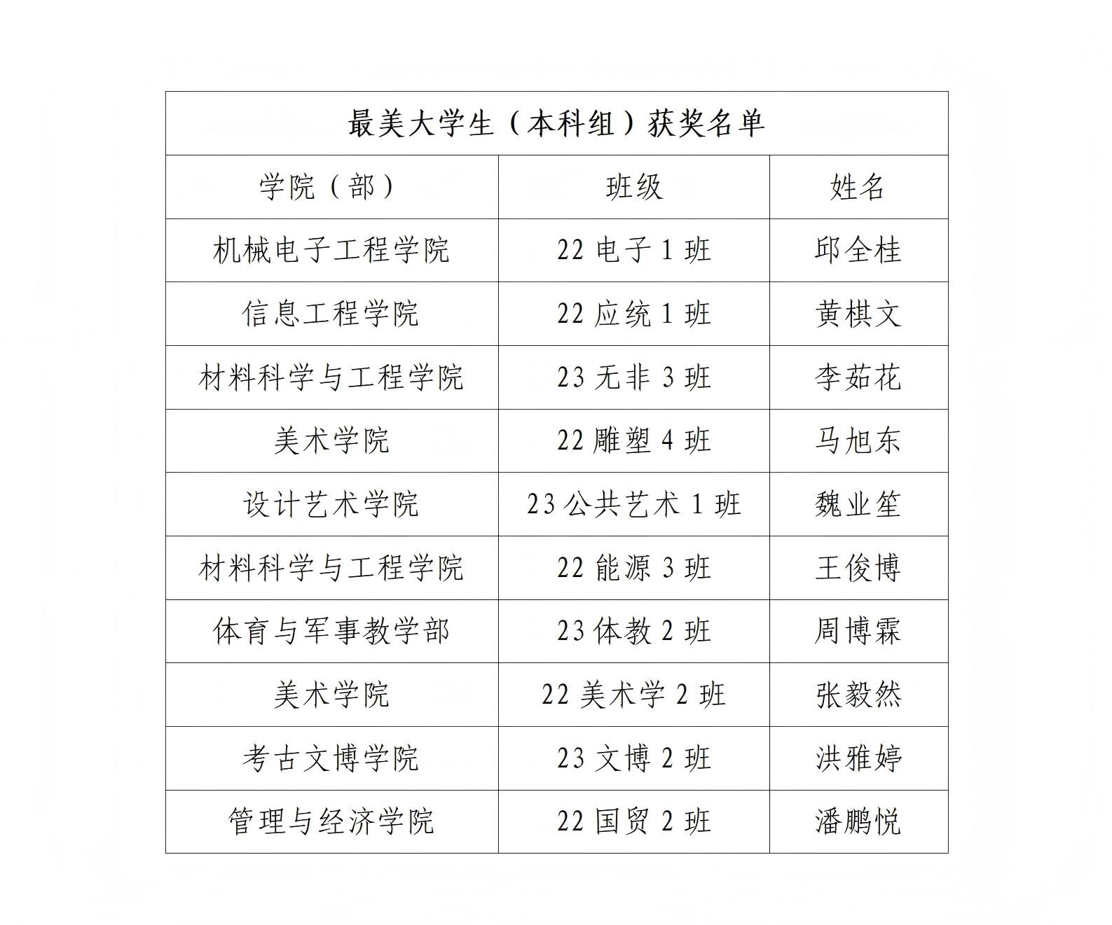 根据学校《关于开展2025年度“最美大学生”评选活动的通知》,经学生个人申请,各学院(部、系)推荐,学工处审核并组织评选活动,评选出2025年“最美大学生”(本科组)10人和“最美大学生”(研究生组)10人,拟获奖,具体拟获奖名单如下: