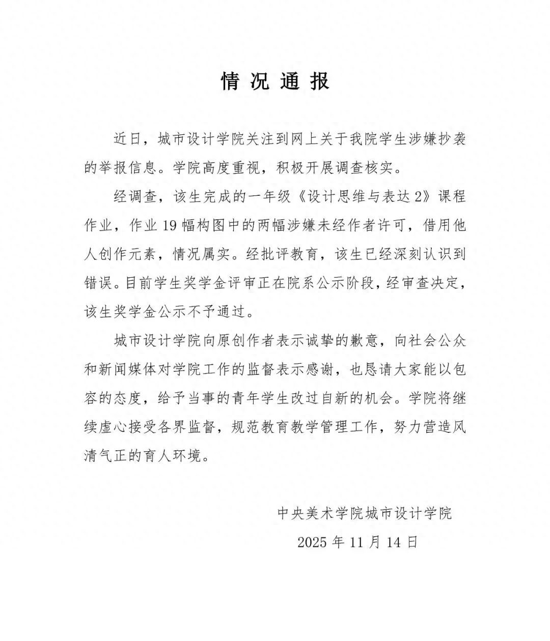 11月15日,中央美术学院城市设计学院发布情况通报:近日,城市设计学院关注到网上关于我院学生涉嫌抄袭的举报信息。学院高度重视,积极开展调查核实。