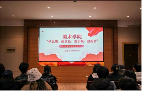 美术学院学生宣讲团走进组织社团,为学生会、自管会以及同心圆的同学们带来以“学思想、强党性、重实践、建新功”为主题的理论宣讲。他们用一个个生动的事例、一张张精美的图片,从美院青年的视角出发,将“大道理”转化为“小故事”,将美术思政融入宣讲,形成具有美院特色的学生宣讲体系,激励美院学生干部将理论知识内化于心、外化于行,坚定不移听党话、跟党走。