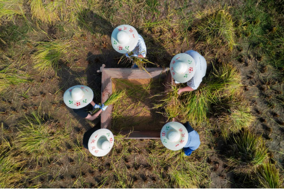 “三指握稻秆,镰刀呈45度斜切,利用手腕发力。”农耕人员手持镰刀向同学们进行示范。随后,在农耕人员的指导下,同学们纷纷卷起衣袖,拿起镰刀,俯身弯腰,兴致勃勃地投身到热火朝天的收割劳动中。起初,面对成片的稻田和锋利的镰刀,同学们显得有些生疏,但很快大家掌握了动作要领,弯腰、揽稻、下镰、堆放……动作逐渐变得熟练起来,"咔嚓"声此起彼伏。“这是我第一次真正下地割稻子,亲身感受到了稻穗的沉实,也更加懂得了劳动的艰辛与不易。”24级美术专业黄靖如在休息间隙擦拭着汗水感慨道。汗水浸湿了衣背,泥土沾满了裤脚,金色的稻浪与青春的身影交织成一幅动人的画卷。