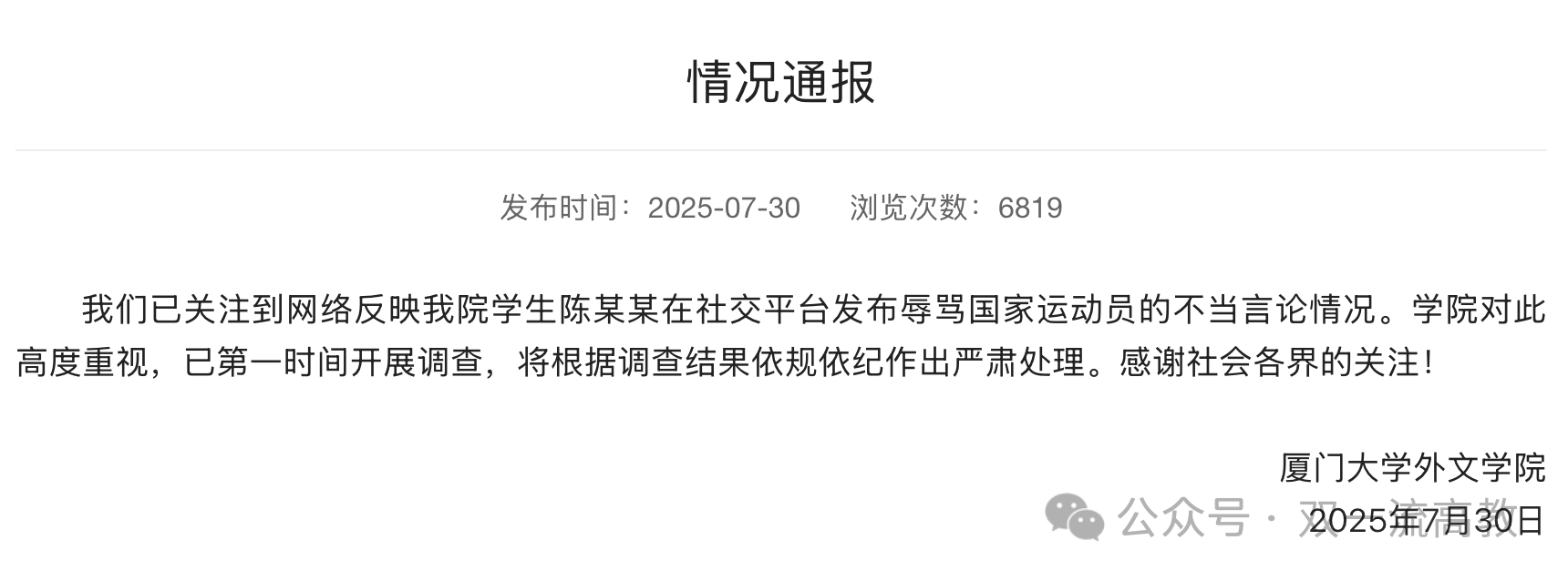 7月30日,厦门大学外文学院发布通报,确认已关注到网络舆情,第一时间启动调查,承诺依规依纪严肃处理。