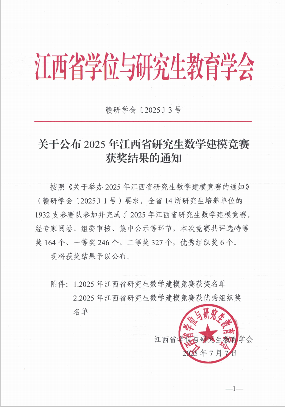 本网讯(文/余少奇 徐嘉)近日,2025年江西省研究生数学建模竞赛成绩公布,我校组织参赛队伍共21支,10支参赛队伍获省级奖项,其中特等奖5项,一等奖5项。