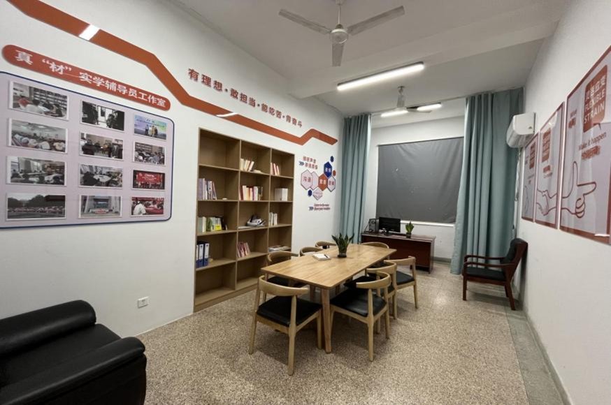 根据工作室的定位和需求,选择了材料科学与工程学院最便利的1楼104房间,最靠近入口和学院考研自习室的场地作为工作室的办公室地点。室内沙发、桌椅、电脑、书架等办公设施齐全,墙面标语、书籍杂志、绿植等安放妥当,可满足办公、一对一谈话、小型会议,小型活动等功能,布置温馨,环境良好。其余可用场地有8号楼一楼3间考研自习室,材料学院活动站,组阶03会议室,学院二楼辅导员之家,学工、团委办公室。建立工作室网络宣传队伍。借助学院公众号、视频号等平台,开展教育宣传,实现网络育人的效果。