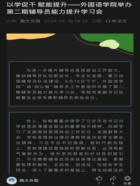 3.成果转化。积极发挥公众号的宣传作用。以“陶大外院”微信公众平台为依托,开设“外院每月之星”、“研途有语,逐梦同行”等栏目,定期推送工作室相关建设成果,吸引学生的关注,最大限度地提升工作室的传播力、引导力、影响力,打造全方位育人格局,有效发挥理论研究的推广作用。将工作室在思想品德教育、心理健康教育、职业规划教育等方面的研究成果,通过课题申报、论文发表等方式进行推广。